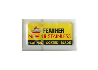 Til slutt har man bladet som neppe er særlig tilgivende hvis man gjør en feil, og dette er absolutt skarpe blad fra annerkjente Feather (som også lager kniver). Dette er blader man behandler med respekt, og er svært forsiktig med. Absolutt nybegynnere burde muligens prøve ut Gillette eller Derby før de prøver seg på disse. Men gjør man det riktig, blir sluttresultatet i en klasse for seg. Prisen er heller ikke så avskrekkende, for ca. 120 kr. fikk jeg 50 blad på ebay inkl. frakt. Litt dyrere enn Derby med andre ord, men absolutt et skarpere alternativ.